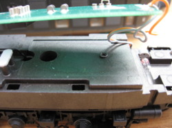 Z lewej strony silnika jest za mało miejsca nawet na dekoder, a co dopiero na komorę. Nad silnikiem niczego nie zmieścimy, nawet dekodera, gdyż silnik jest na tyle wysoki, że sięga niemal sufitu obudowy. Zaraz po prawej stronie silnika, instalacja komory odpada z kilku powodów. Mamy tutaj bowiem przewody płytki (które na upartego może udałoby się odpowiednio poodginać), oraz z ramy odstają śruba blaszki którą przykręciliśmy, oraz dwa malutkie stalowe wsporniki, pomiędzy którymi w oryginale umieszczało się kable by się nie plątały wewnątrz modelu oraz od góry nasadzało się plastikową zworkę. Byłoby trzeba zatem komorę umieścić nad tymi elementami, ale nie można zapominać że nad nią znajdować się jeszcze musi płytka elektroniki. Komora umieszczona nad tymi elementami dała by nam płytkę umieszczoną zdecydowanie za wysoko, by zmieścić się pod sufitem modelu. Dodatkowo zaś, w tym samym miejscu po zamknięciu obudowy znajdzie się długi wspornik jaki odstaje od sufitu obudowy, a do którego przykręca się od dołu modelu śrubę do montażu obudowy z podwoziem (na zdjęciu po lewej u dołu).